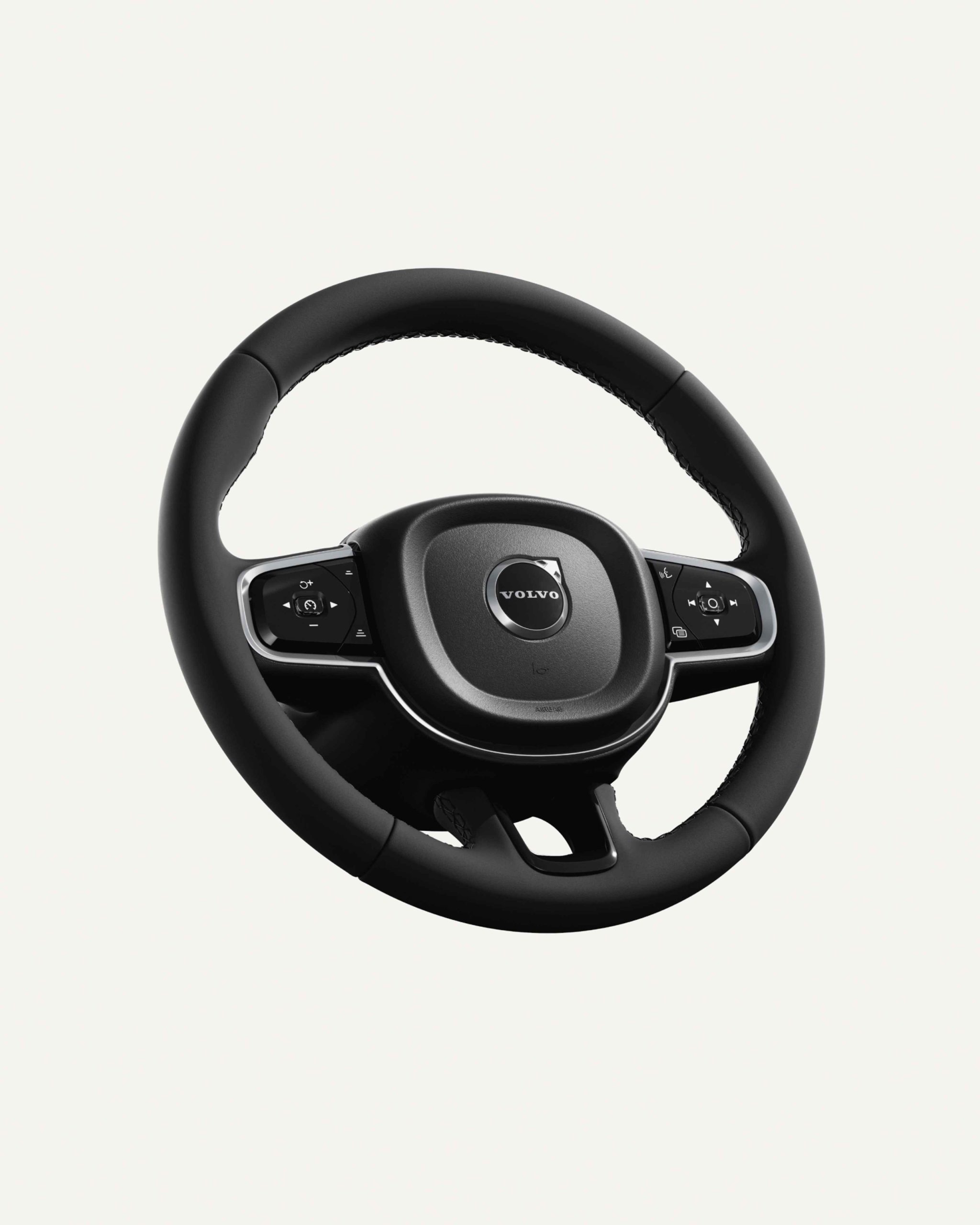 Vô-lăng ba chấu được bọc chất liệu da cao cấp hoặc da hai tông màu nếu bạn chọn bọc da Nappa màu vàng. Xe có tay cầm thể thao và vẻ ngoài tinh tế, với đường khâu tay phối màu, viền lụa satin và các điểm nhấn màu đen bóng. Các nút bên trái quản lý các chức năng như kiểm soát hành trình và Pilot Assist. Các nút bên phải điều chỉnh âm thanh, thông tin giải trí và giao tiếp.